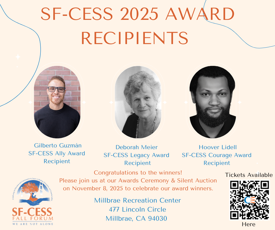 A word about our theme: We Are Not Alone: A Gathering for Educators and Communities to Focus on Healing, Disruption, and Transformation. Guiding SF-CESS’ work is its Framework for Transformation. This framework outlines four domains of work that must be supported for individuals and communities to engage in the constant and continuous work of transformation. Our theme derives directly from our third domain which states that we, in order to make new meaning of the inequities that persist, must commit to doing our own work in three different spaces: Alone – In Affinity – and Across Difference. Again, given growing and intentional division across our country, we heard the need for people to come together in community. In this space, we hope you will bring and be able to attend to the individual (alone) goals you have for improvement and transformation. We also believe our theme and extended community of educators and allies who share (affinity) enough basic beliefs about children, schools, and communities will support fostering a brave space for the challenging work facing us. Finally, we are building on thirty years of previous Fall Forum that always demonstrated the power of educators and allies sharing promising practices from diverse contexts and perspectives (across difference).